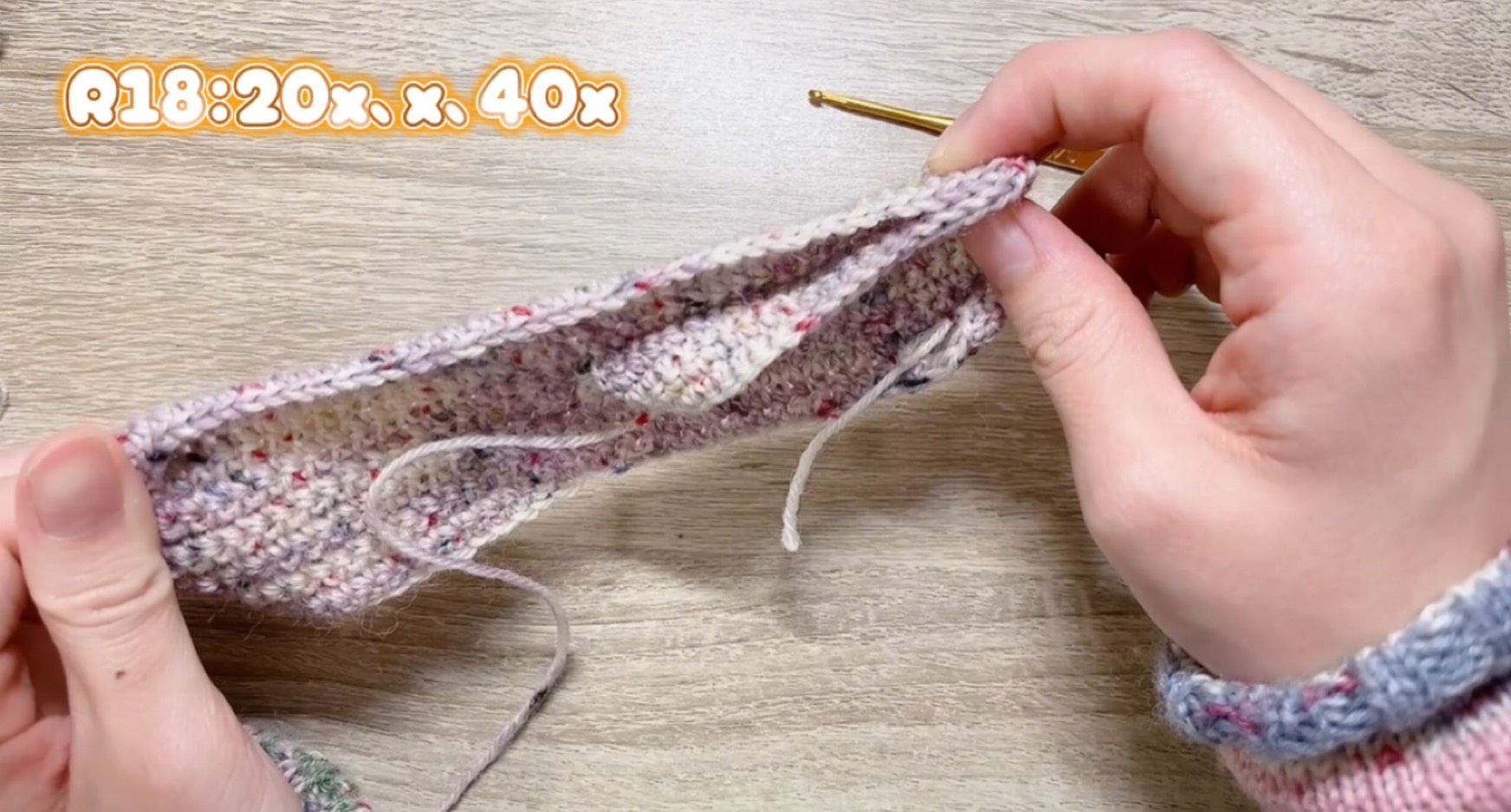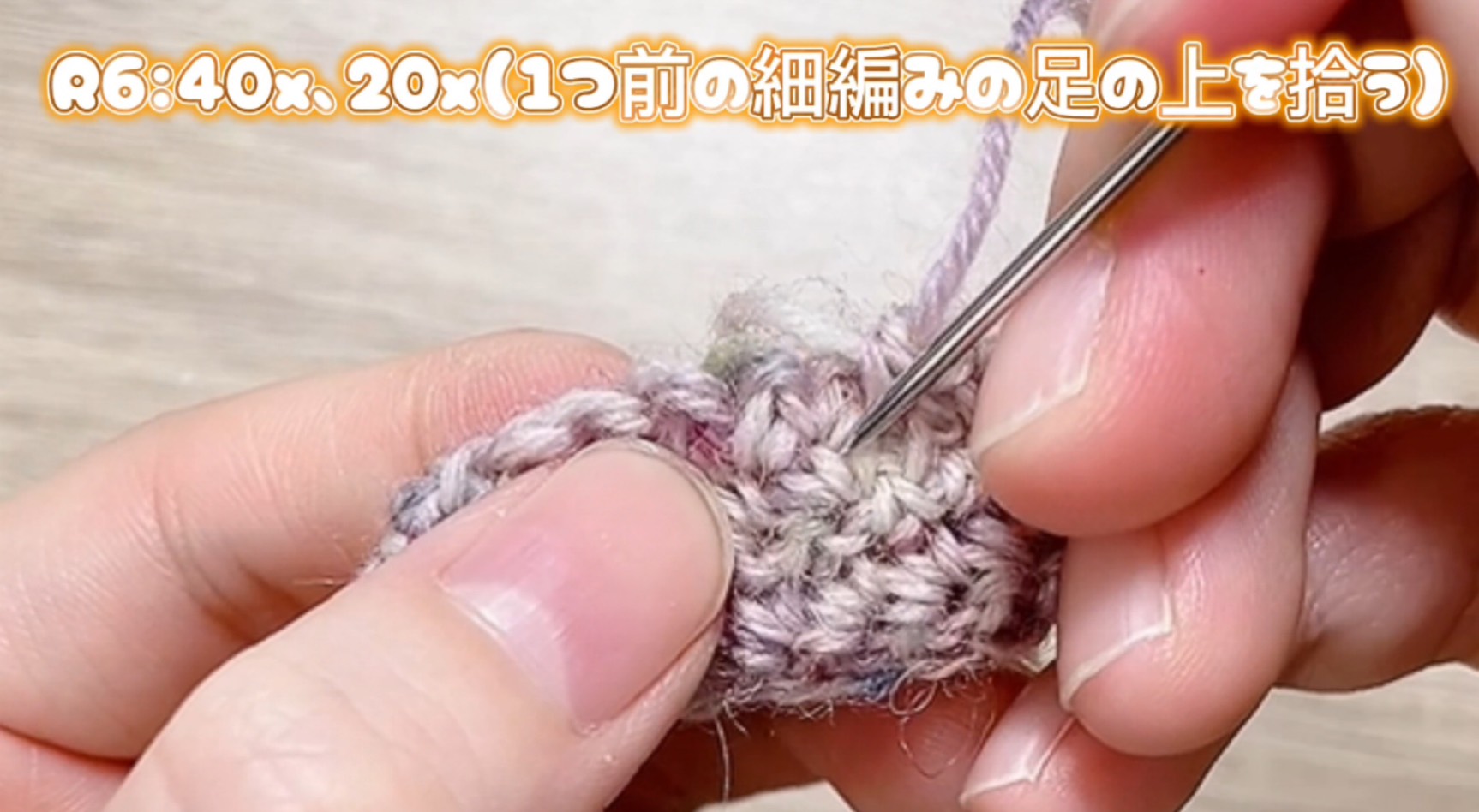 R6:40x、鎖一つで立ち上がりひっくり返してから20x(1つ前の細編みの足の上を拾う※ここでは、20目めは一つ前の細編みの足の上の斜め上を拾って細編みをする。R13以降は足の上を拾って細編み。)