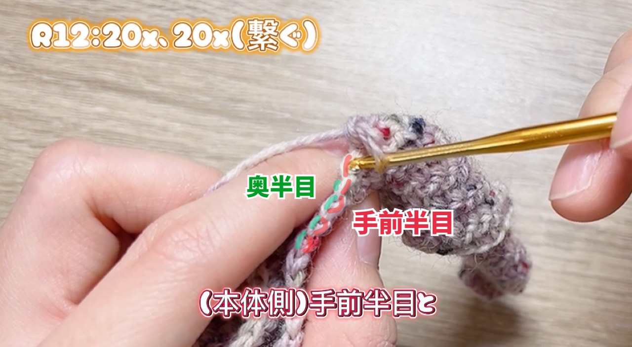 ・細編み20目めはーを拾って編みます