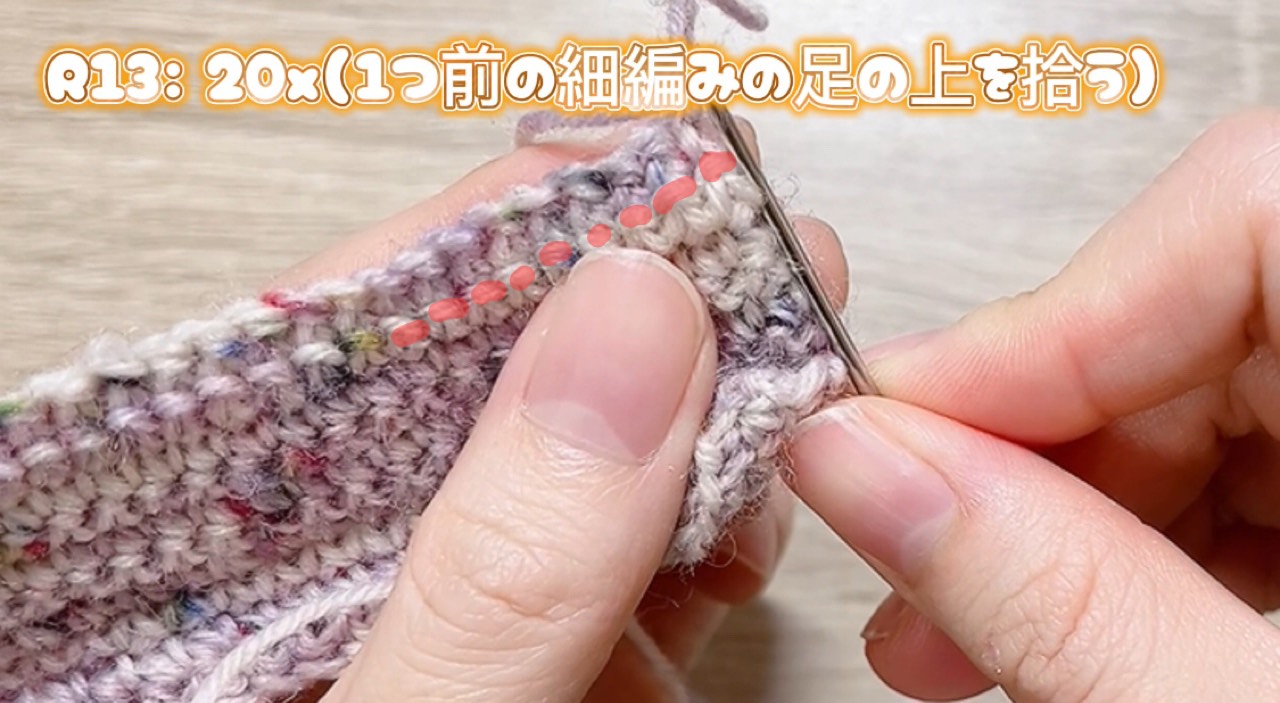 R13: 20x(1つ前の細編みの足の上を拾う)