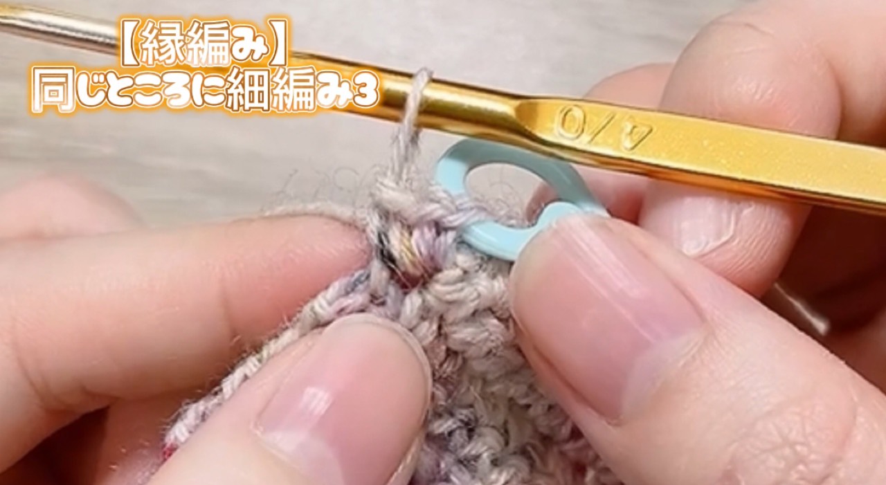 ・同じところに細編みを3目編みます。1回目の細編み3目では、一番最初のところ(細編み1目め)にマーカーを入れます。2回目の細編み3目では、一番最後のところに(細編み3目め)にマーカーを入れます。