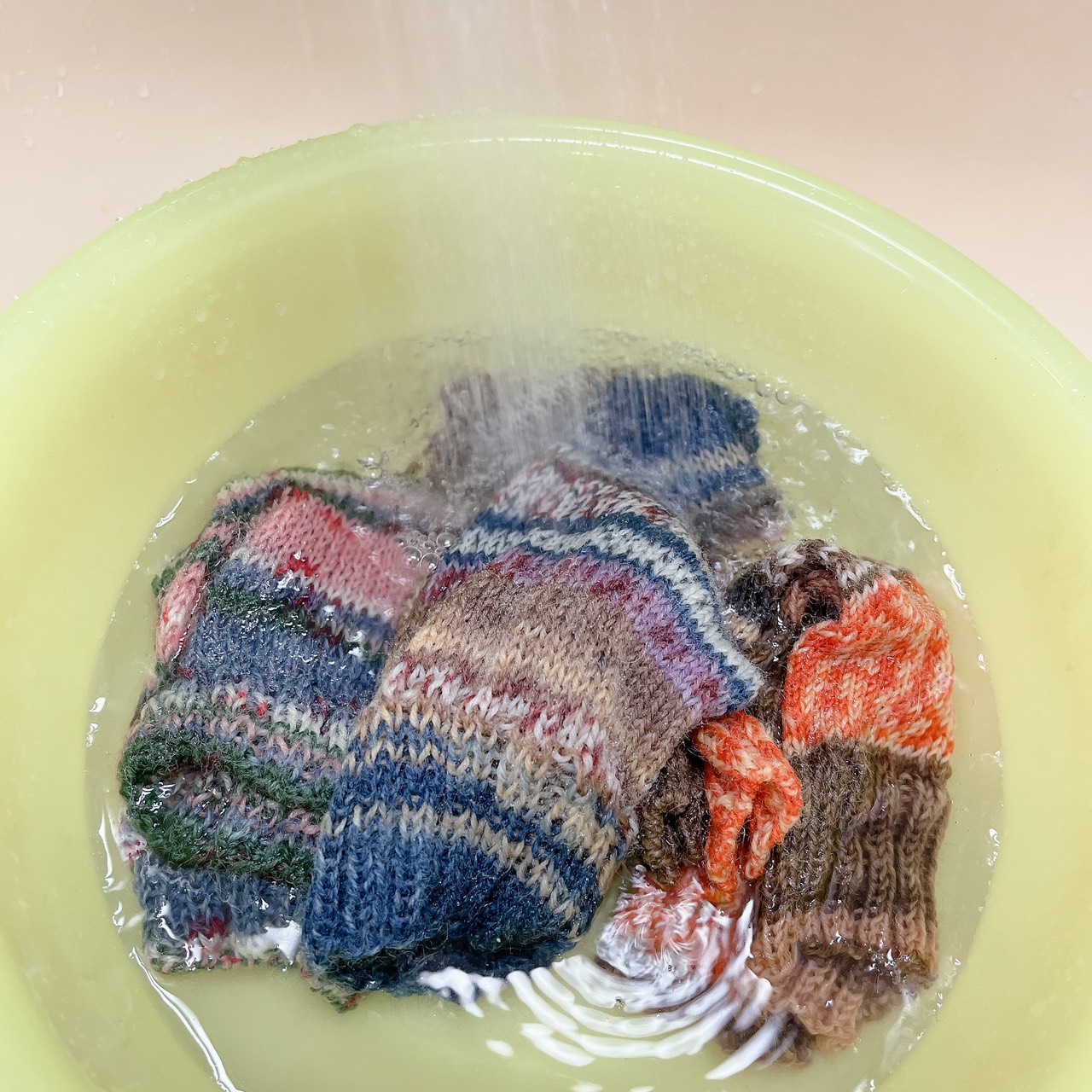 新しい毛糸は、繊維が張っている。また、糸を作る段階で油が混ぜ合わせられるそうで、糸が硬い。水通しをすると繊維が柔らかくなり、汚れも落ちるから手触りがよくなるらしい。