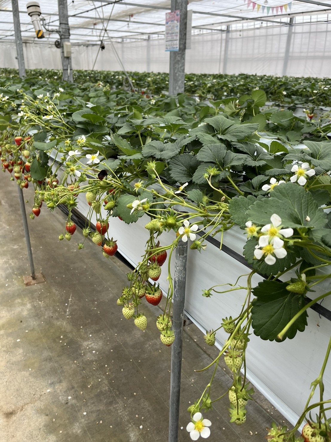 ビニールハウス内には、とちおとめ、おいcベリー、ベリーホップはるひ、もういっこ、よつぼし、ゆうやけベリー、章姫などなどいちごが沢山!